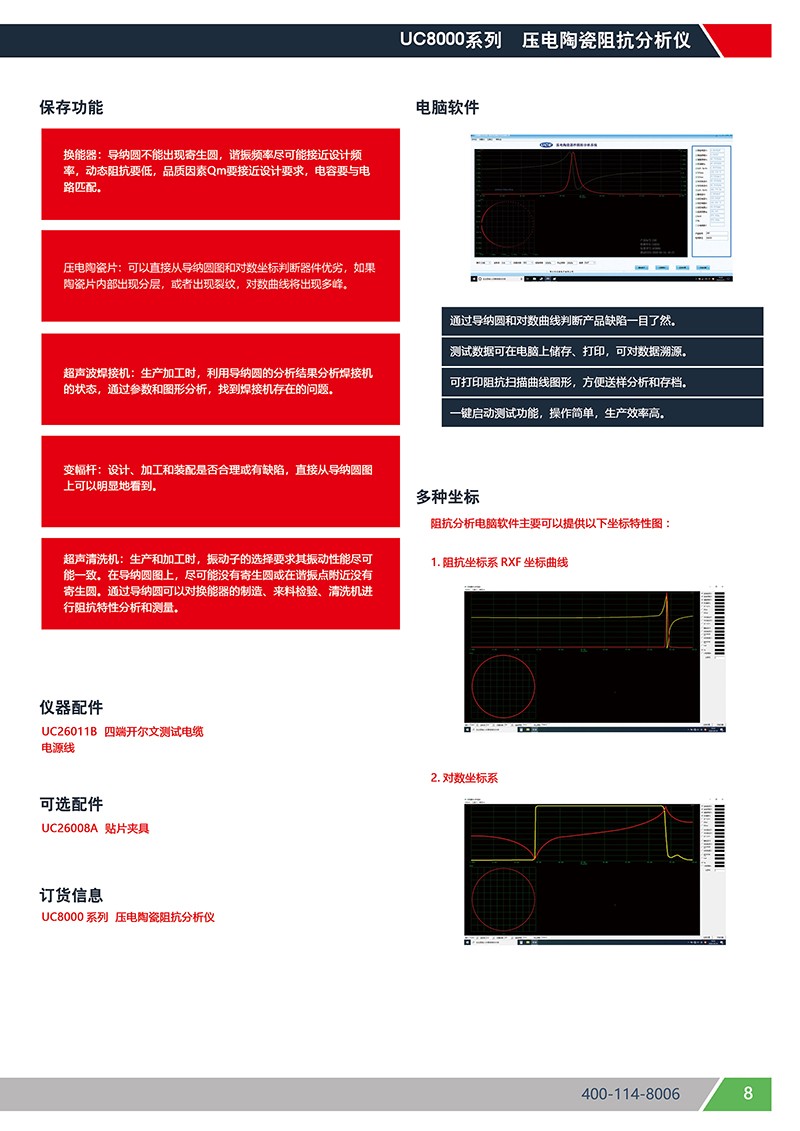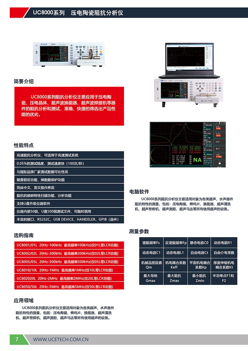 UC8000系列阻抗分析仪主要应用于压电陶瓷、压电晶体、超声波换能器、超声波焊接机等器件的阻抗分析和测试,准确、快捷的筛选出产品性能的优劣。